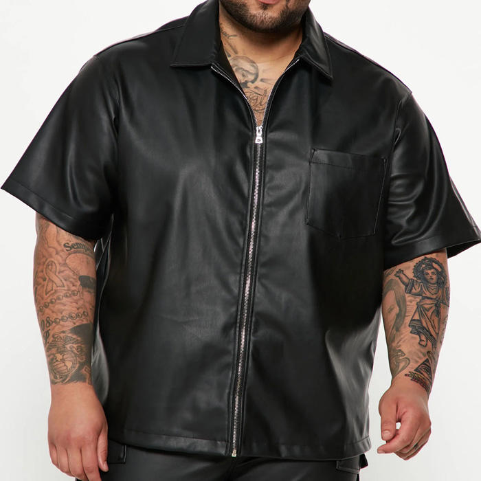 High Quality Men Luxury Leather Shirt Collage Custom Pu Leather Zip up Shirt Hip Hop Short Sleeve Oversized