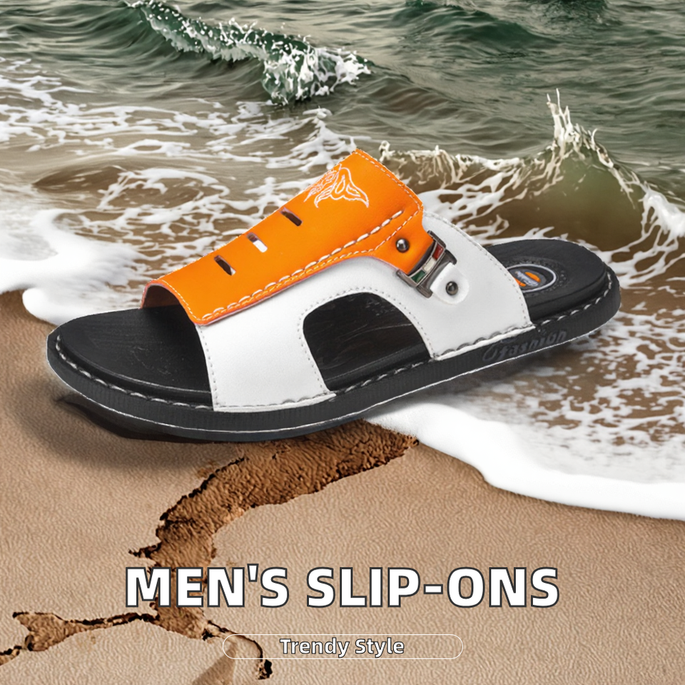STOJEK High Quality Men's Color-Blocked Genuine Leather Upper Soft-Surfaced Slip-On Indoor/Outdoor Slippers Metal Buckles Rubber