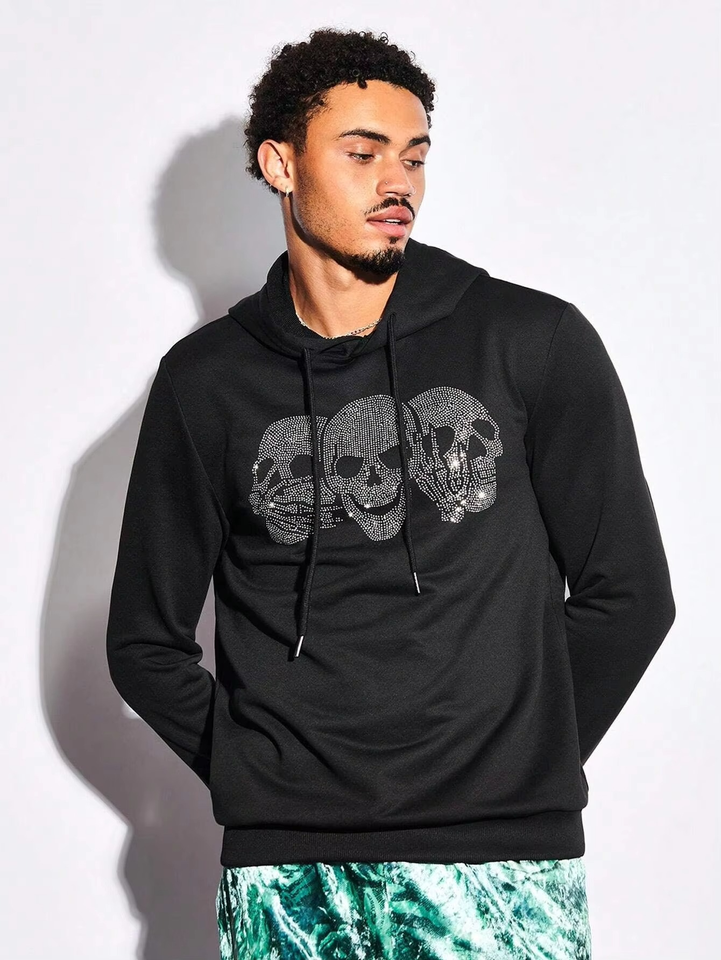 High Quality Men's Customized Sun Faded Pullover Hoodie Streetwear Hip Hop Style Rhinestones 100% Cotton Black Oversized