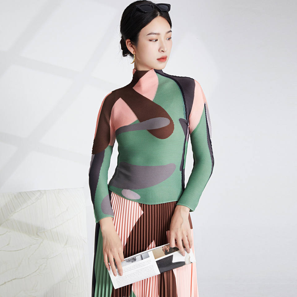 High Quality Miyake Pleated Chiffon T-shirt Women's High Collar Slim Fit Eco-Friendly Fashion Printed Tops Clothing Spot