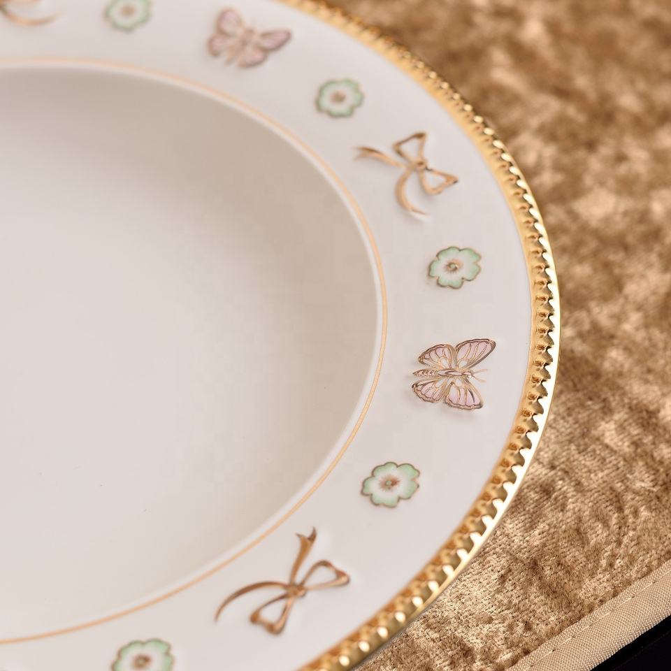 High Quality Modern Pink Butterfly Pattern European Bone China 9-Inch Deep Plate Tableware Set