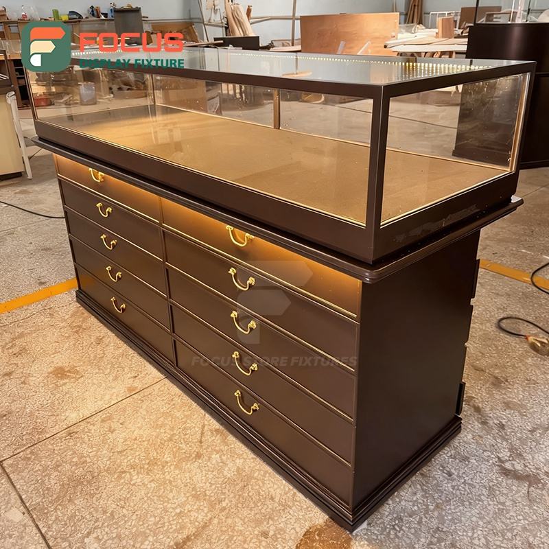 High Quality Modern Wooden Jewelry Counter Glass Display Cabinet Metal Structure Design for Shopping Mall