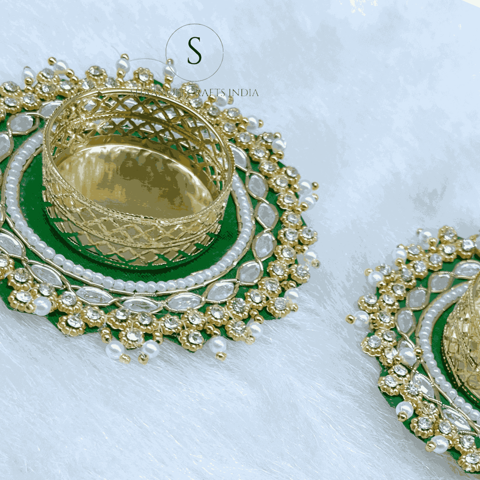 High Quality Multicolor Round Shape Tea Light Candle With Mirror Work Pearl Beads Rangoli Set for Home Office Diwali Decoration