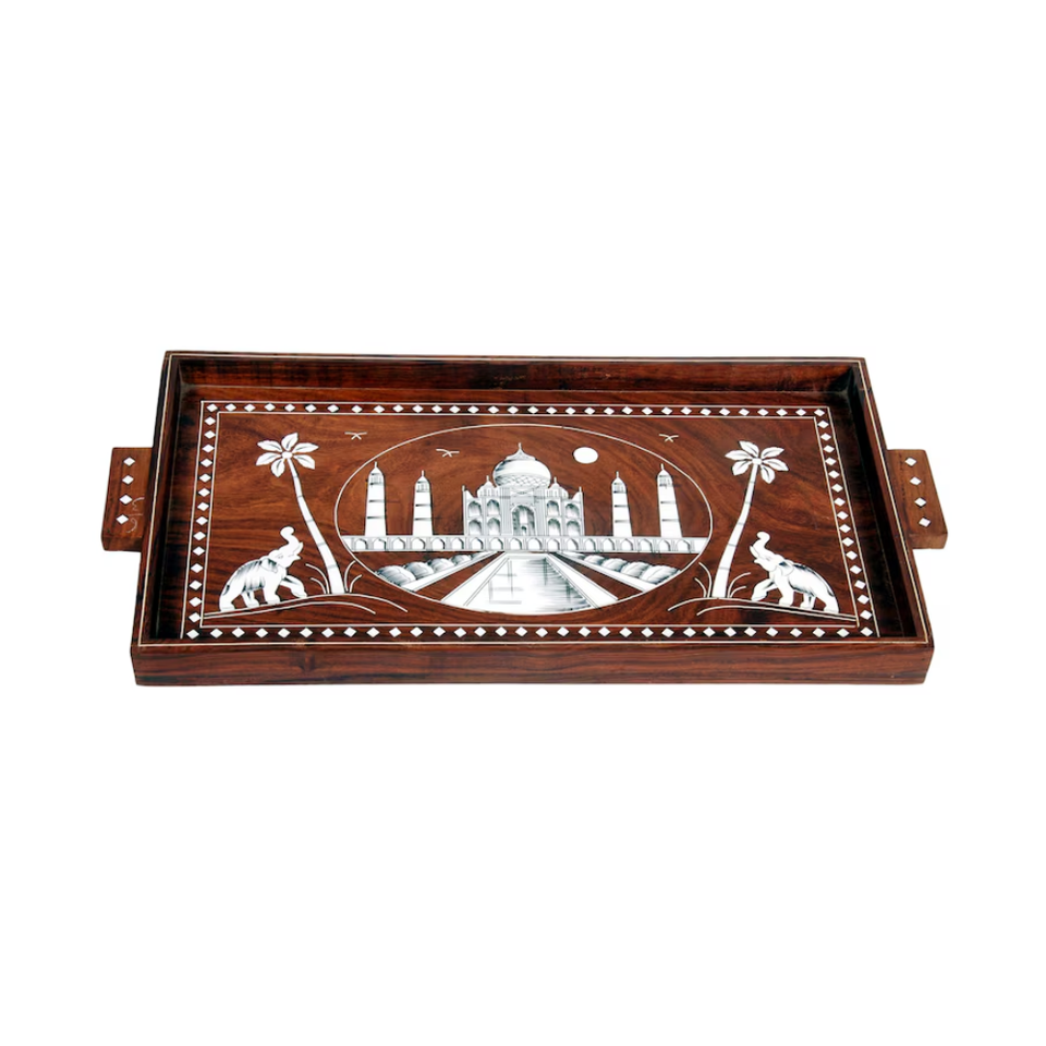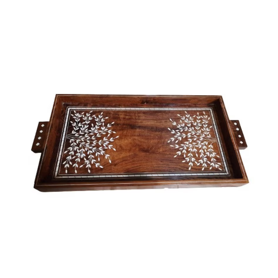 High Quality Natural Wooden Serving Tray Mother of Pearl Inlay for Arabian Party Tableware Wholesale From Vietnam