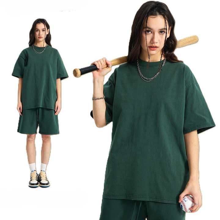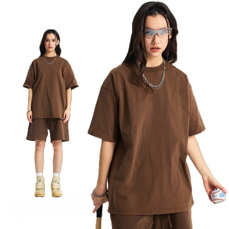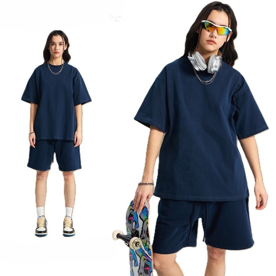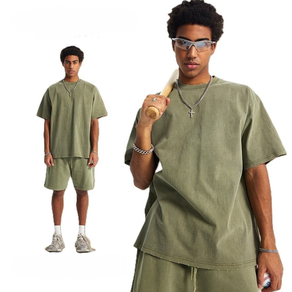 High Quality 100% Cotton Heavyweight Washed Vintage Distressed Essential Streetwear Crew Neck T-Shirt Casual Shorts Set For Men