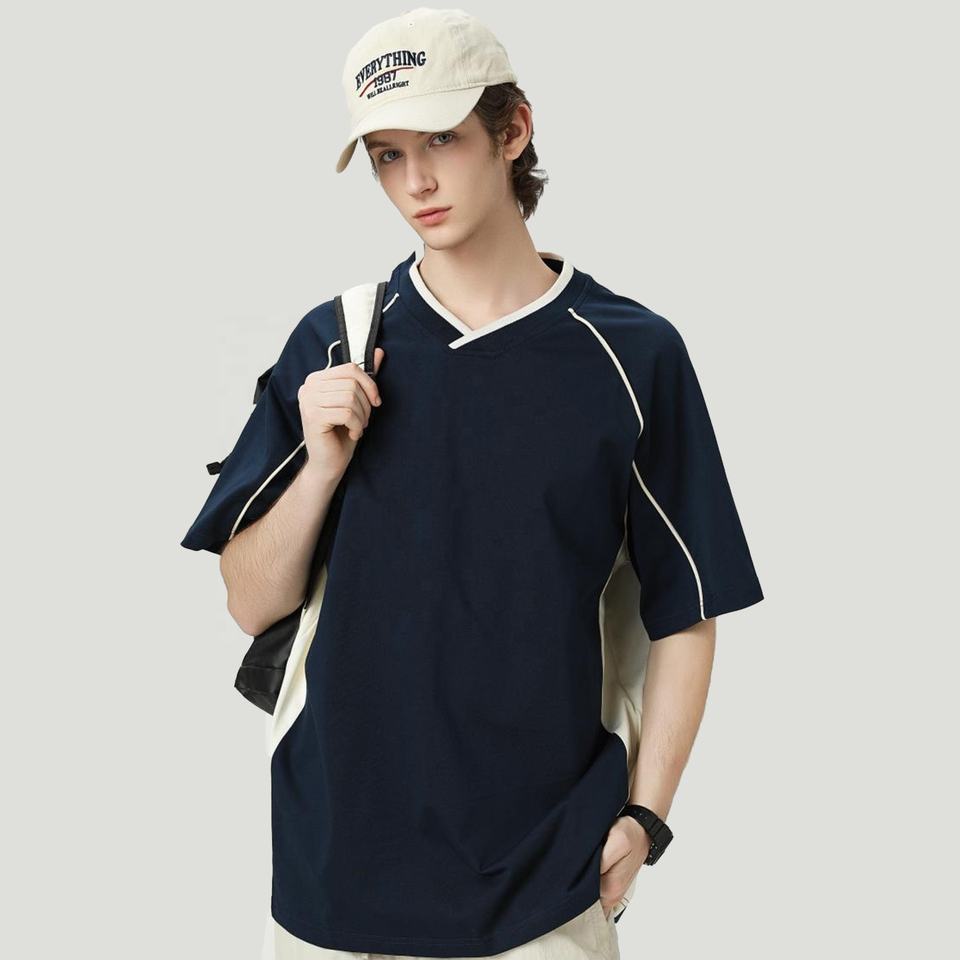 High Quality 260gsm 60% Cotton 40% Polyester Oversized Athleisure Jersey Contrast Piping Raglan Sleeve V-Neck T-shirt For Men