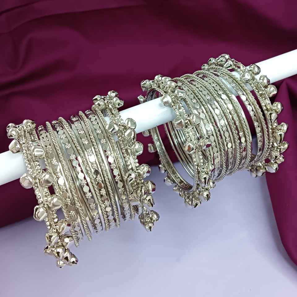 Embellished with ghunghroo, floral and geometric pattern metal bangles
