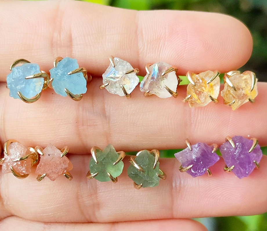 High Quality Peach Moonstone Raw Gemstone Prong Set 925 Sterling Silver Gold Plated Stud Earring Handmade Trendy Women's