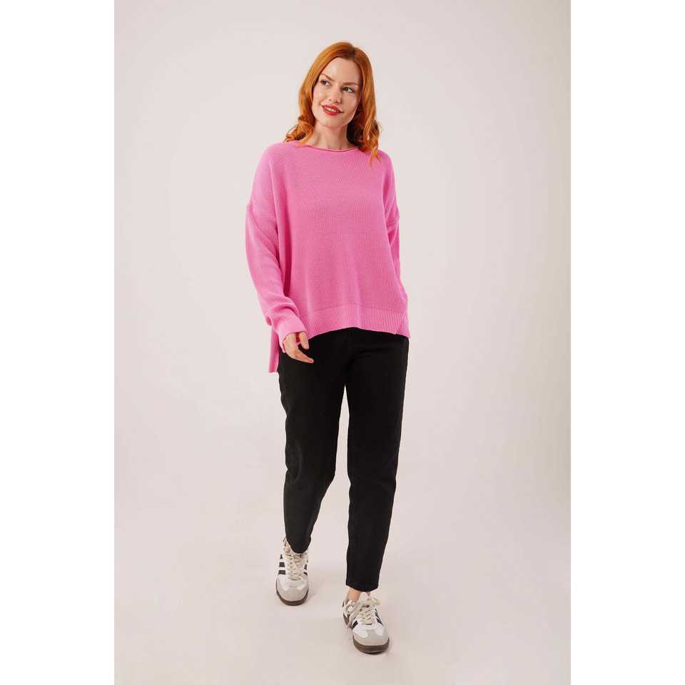 High Quality Pink Knit Sweater Vintage Casual Stripe Decoration Fluffy Ribbed Knit Front Logo Short Slit Side for Autumn/Winter