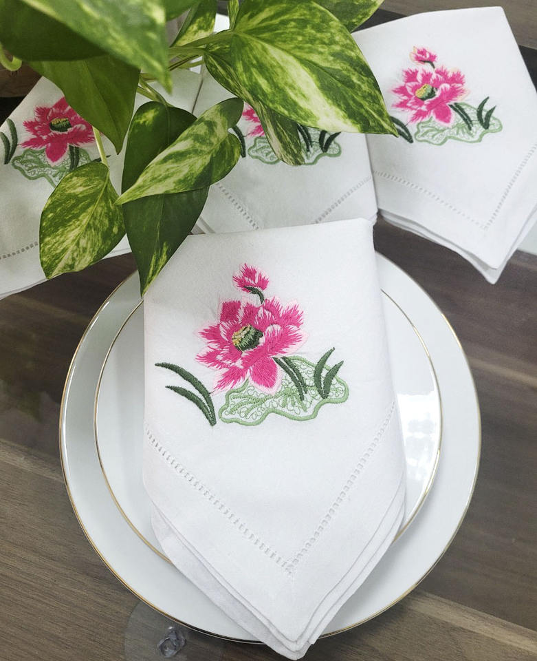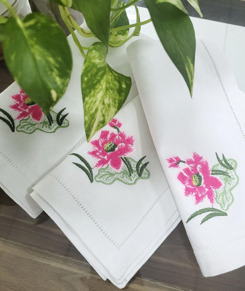 High Quality Pink Lotus Embroidered Napkin Hemstitch Cotton Table Cloth for Weddings & Parties Custom Size for Home & Hotel
