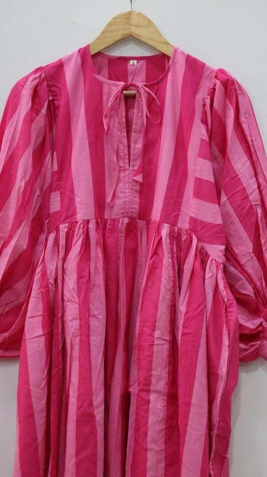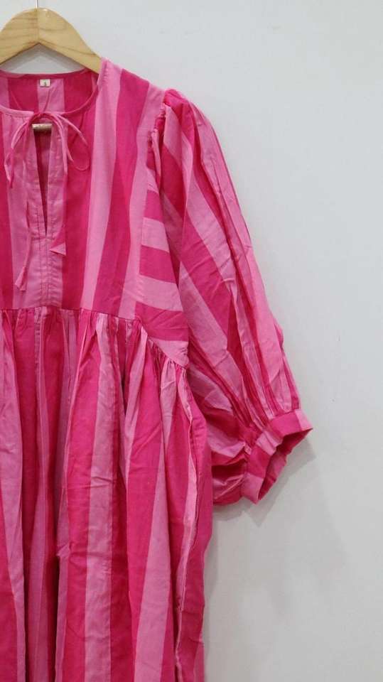 High Quality Summer Mini Dress Pink Striped Midi with Deep Neck String Closure Natural Long Block Print Perfect Gift for Women