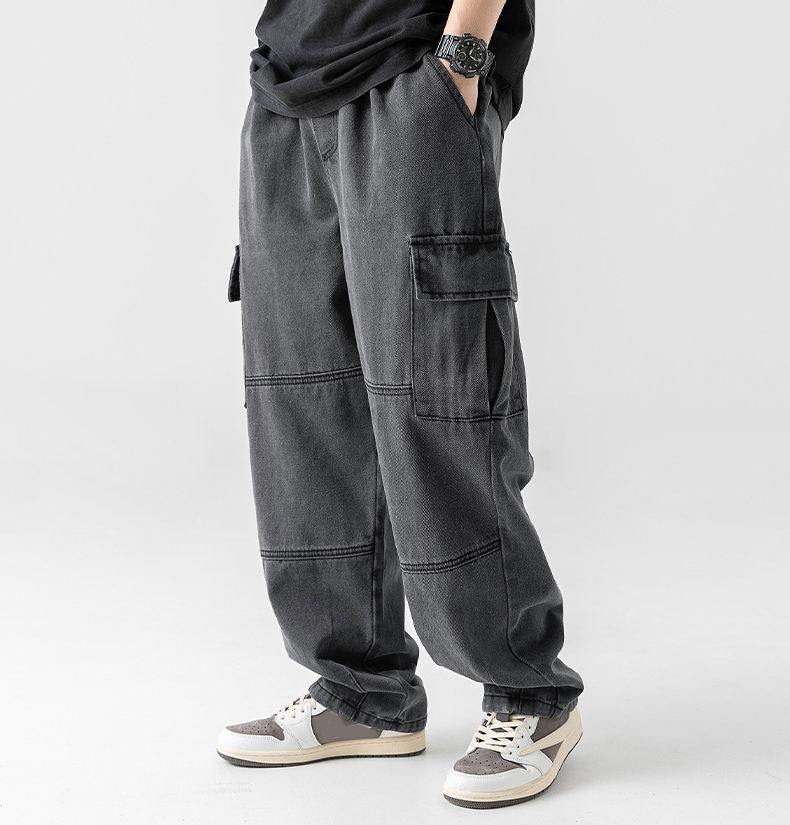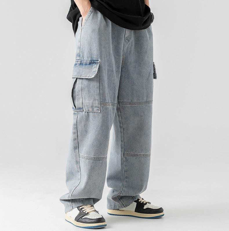 High Quality Plus Size Men's Jeans Drawstring Elastic Mid Waist Acid Washed Loose Custom logo Straight Flare Denim Cargo Pants