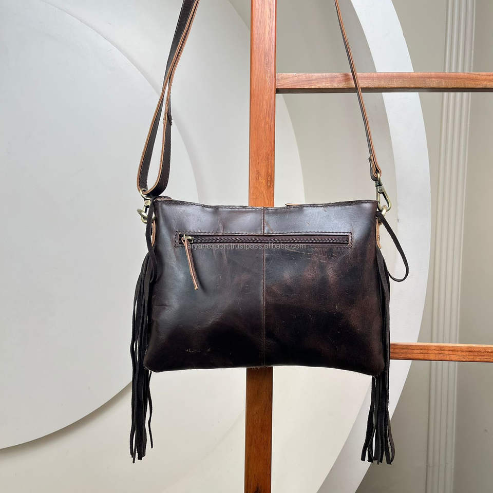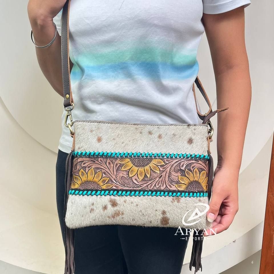 Product name:Hand Tooled Cowhide Leather Fringe Crossbody Bag