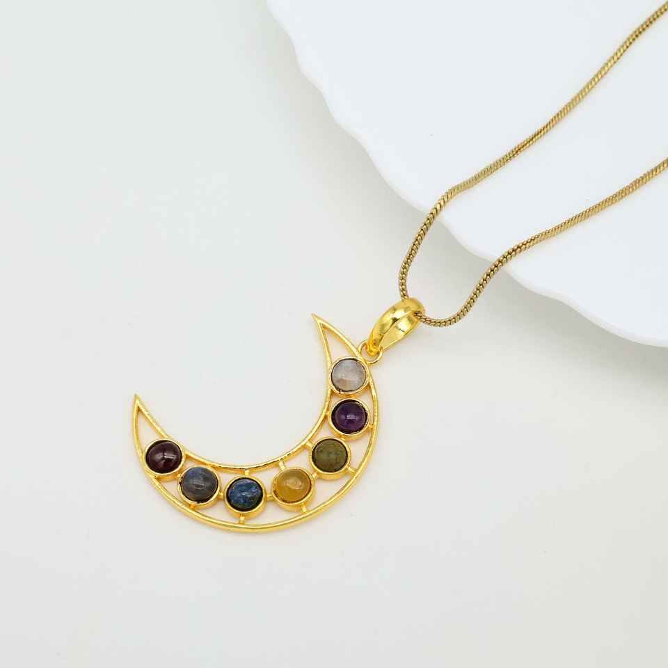 High Quality Product Moon Crescent Rainbow Pendant 7 Chakra Stone Rose Quartz Green Crystals Making Necklaces Brass Jewelry