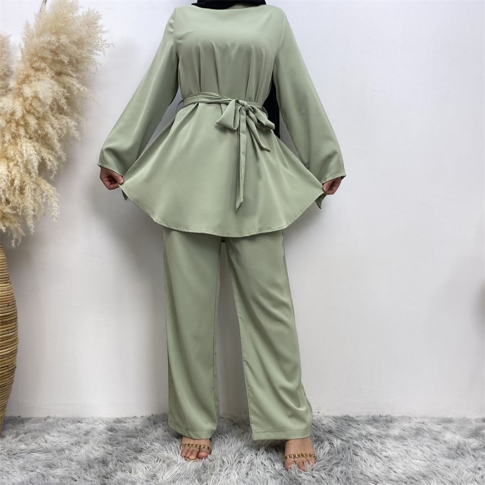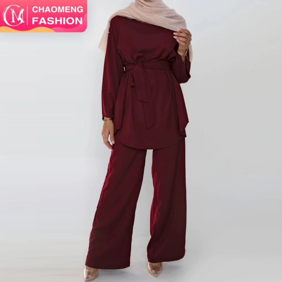 High Quality Pure Color Two Pieces Set Simple Blouse and Loose Wide Leg Pant Office Fashion Sets Muslim Modest Abaya Sets 2272