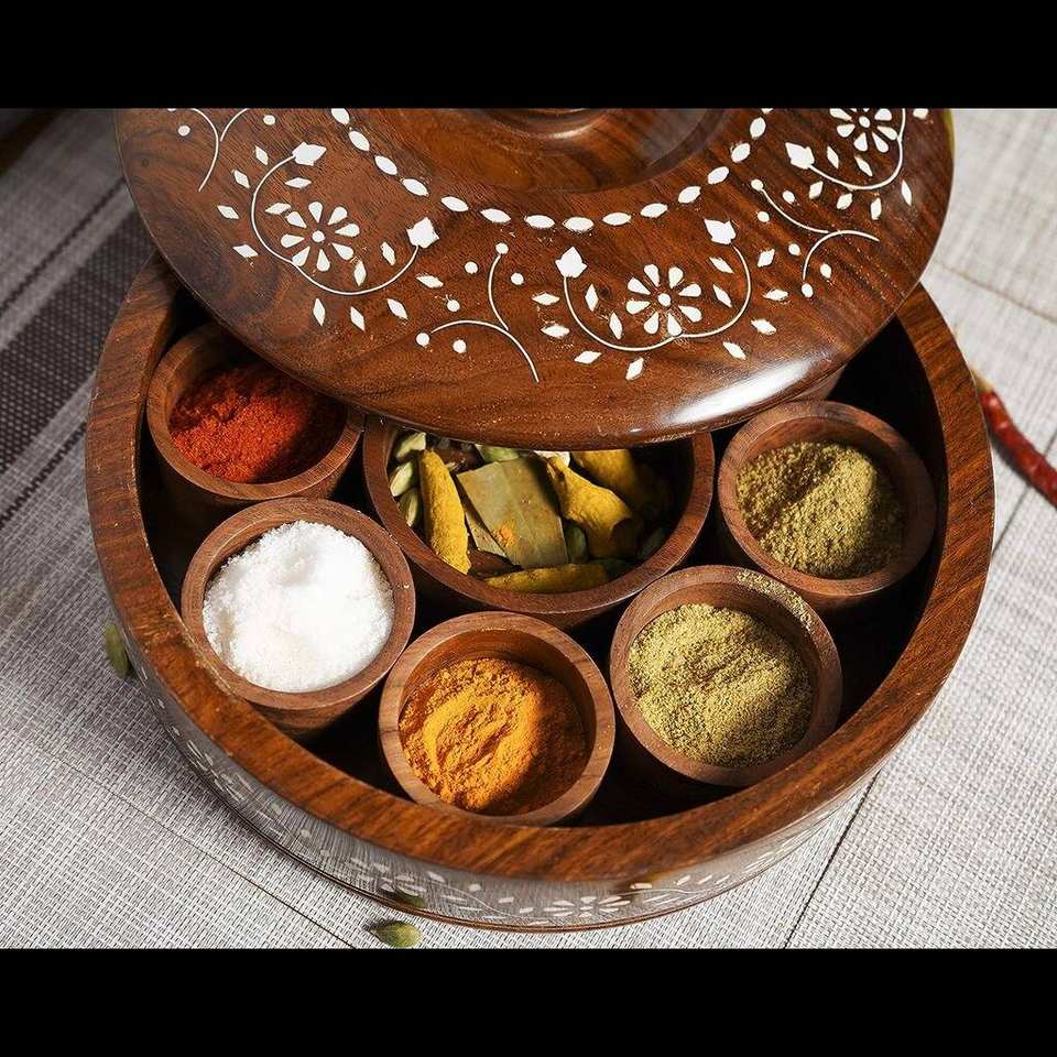 High Quality Round Wooden Eco-Friendly Decorative Spice Storage Chest Herb & Masala Box Drawer Storage Home Kitchen