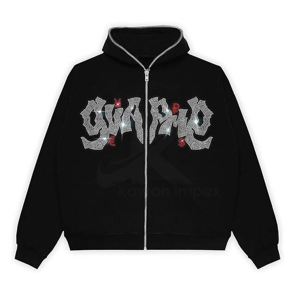 High Quality Screen Print With Rhine Stone Zip Up Hoodie For Men's 100%Cotton 450GSM Flees Wholesale and Customized