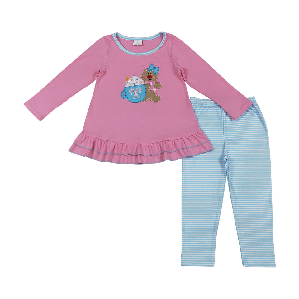 High Quality Silk Girls Toddler Clothing Sets Embroidered Gingerbread Man Hot Pink Long Sleeve Blue Striped Pants New In-Stock