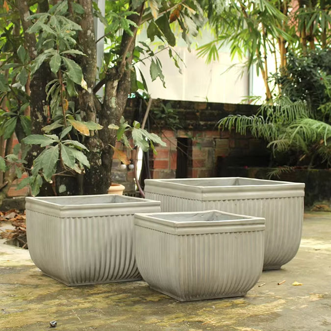 High Quality Square Striped Planter Set of 3 Fiber Concrete Flower Pots for Luxury Outdoor Home & Garden Decorations