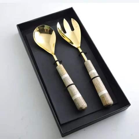 High Quality Stainless Steel Salad Server Spoon Fork Set with Gold Plating Kitchen Accessories for Salads Wood Handle