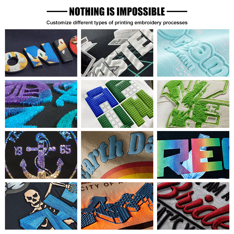 Technics:Embroidered, Printed, Washed, Plain Dyed, Tie Dyed, Puff Print, 3D embroidery, Automated cutting, sequin embroidery, acid wash, Applique