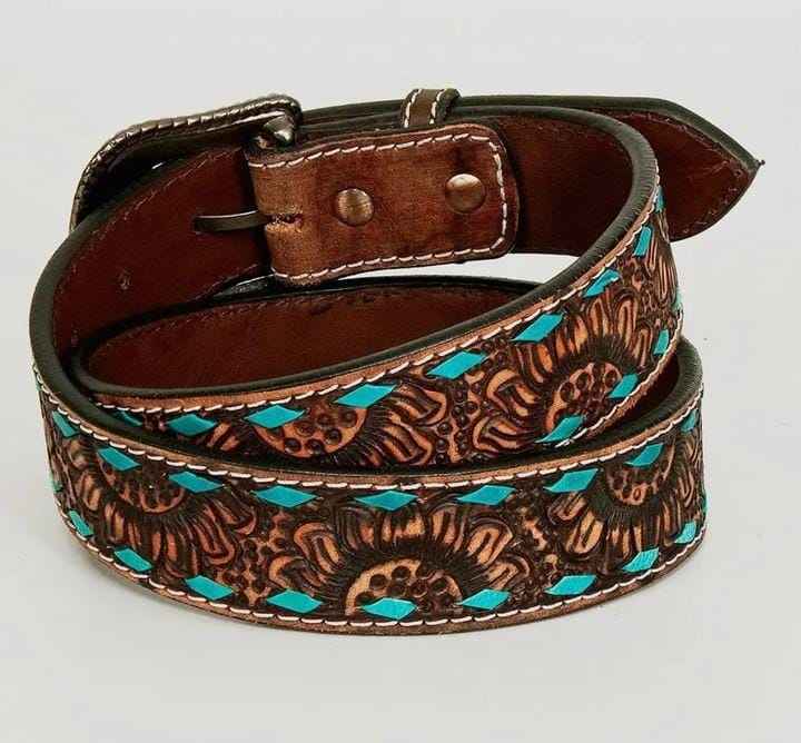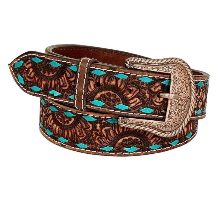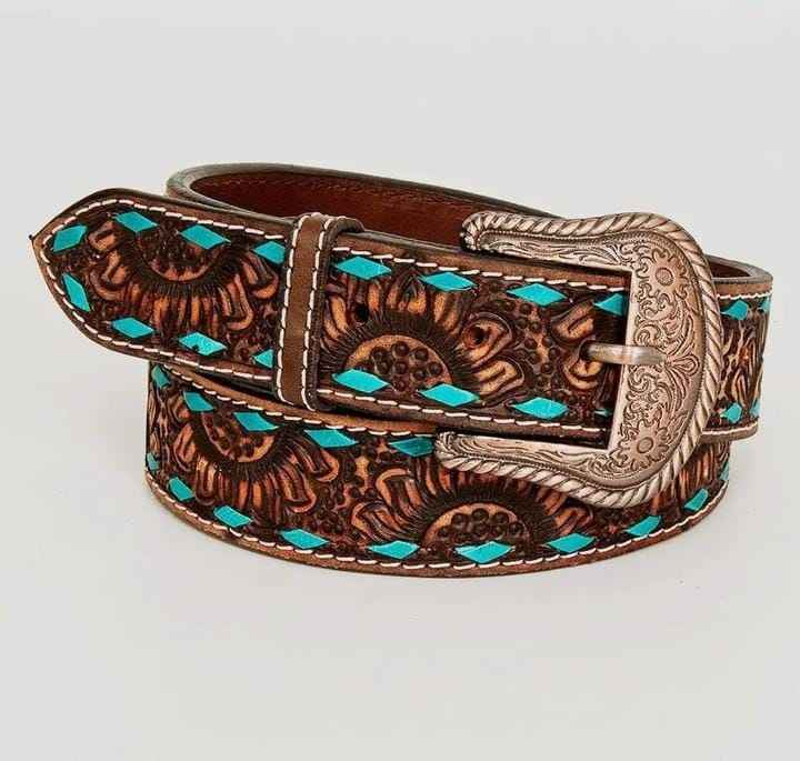 High Quality Sunflower Leather Belt Floral Tooled and Curved Antique Finished Hand-painted at Wholesale Price