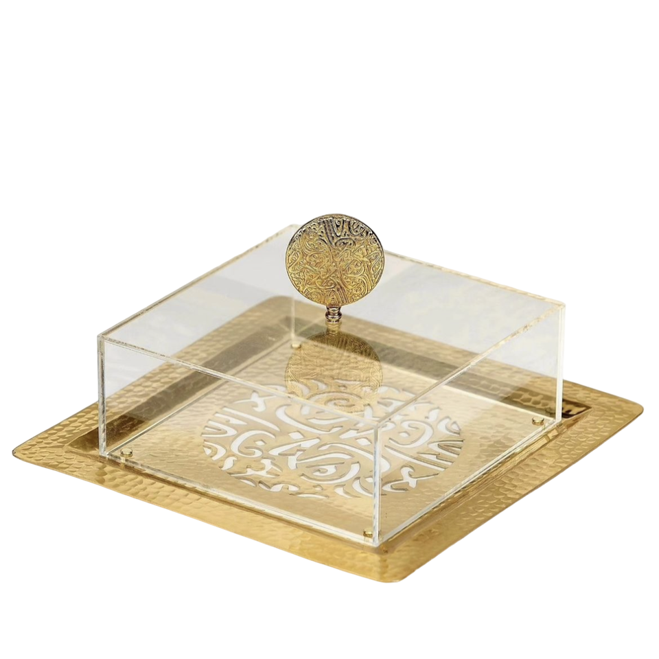 High Quality Sustainable Eco-Friendly Gold-Colored Arabic Design Engraved Glass Dome Customizable Color Metal Tabletop Cake