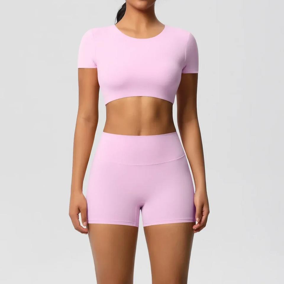 High Quality Trending Gym Yoga Set Short Sleeves Wholesale Workout Tracksuit Stylish Slim Fit Women 2 Piece Set