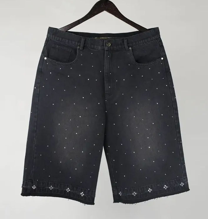 High Quality Unisex Acidwash Allover Rhinestones Denim Shorts Custom Made Bling Jean Shorts For Men Summer Denim jorts