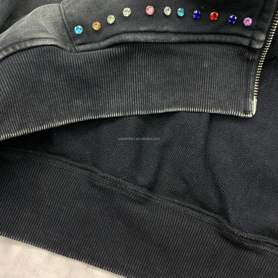 High Quality Unisex Vintage Hoodie Manufacturers Luxury French Terry Zipper Hoodie Acid Wash Oversized Rhinestone Zip Up Hoodie