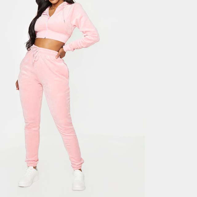 High Quality Velour Custom Embroidered Logo Cropped Velvet Ladies Zip up Hoodie and Jogger Set Tracksuit Flared Pants Set Women