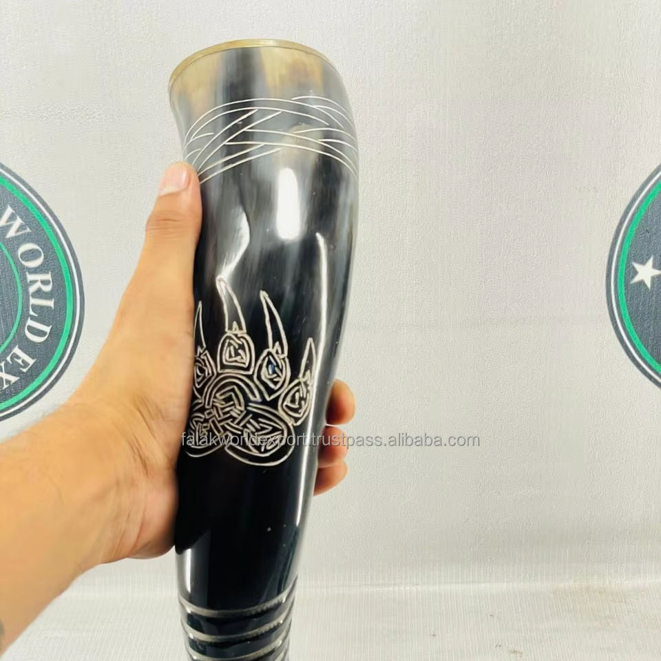 High Quality Viking Drinking Horn with Engraving Natural Crafts Made From Cow Ox Horn With Leather Holder Agate Norse Design FWE