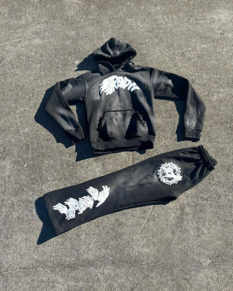 High Quality Vintage Sun Faded 450 GSM Cotton Patchwork Tracksuit for Men Distressed Thick Acid Wash Raw Hem pull up Tracksuit
