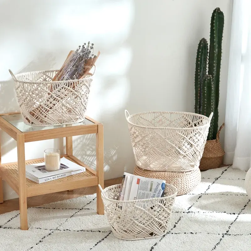 High Quality White Macrame Square Basket Bathroom Storage Organizer Grocery Bin