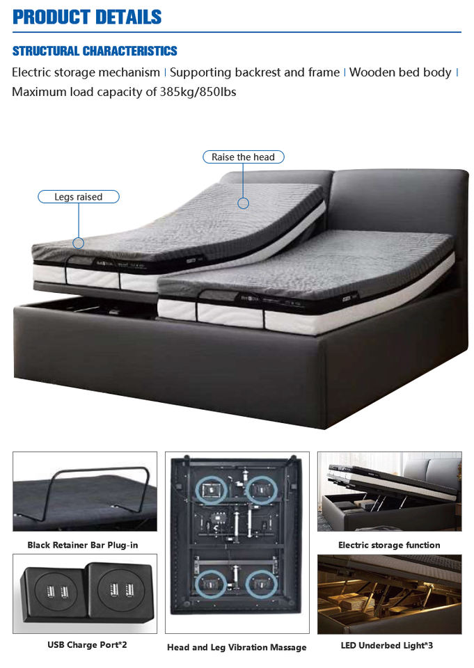 Head/Footlifting,Massage,Dual USB charge port*2,Electric storage