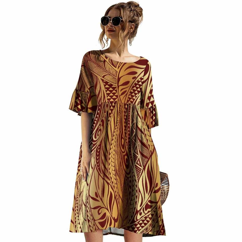 High Quality Wholesale Polynesian Casual Dress Customized Crew Neck Bell Sleeve Dress Knee Length Puffy Ladies Short Dress