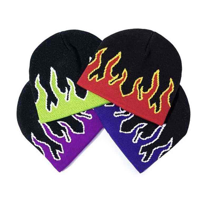 High Quality Winter Warm Green Flame Jacquard Skull Beanie Knitted Caps For Men Make Your Own Design And Logo