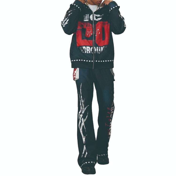 High Quality Winter Woven 100% Cotton Fleece Oversized Zip Pocket Drawstring Hooded Straight Wide Leg Vintage Man Tracksuit Set
