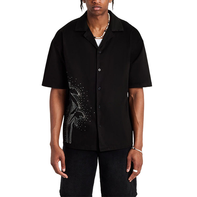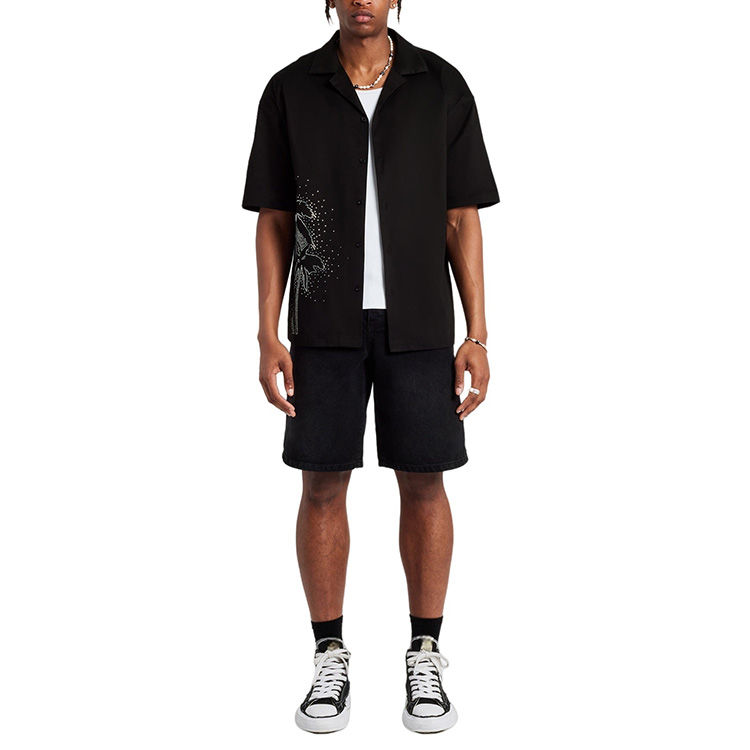 High Quality Winter Woven Oversized V Neck Rhinestone Palm Shirt Set 100% Cotton Button up Black Men's Shirt Shorts Set
