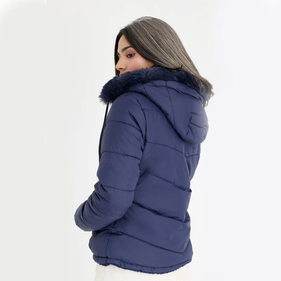 High Quality Women Dark Blue Nylon Quilted Double Sided Puffer Jacket With Faux Fur on Hood and Inner Lining