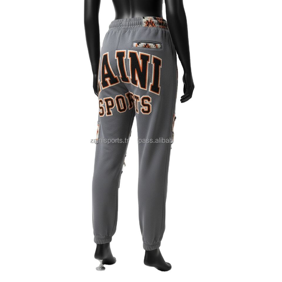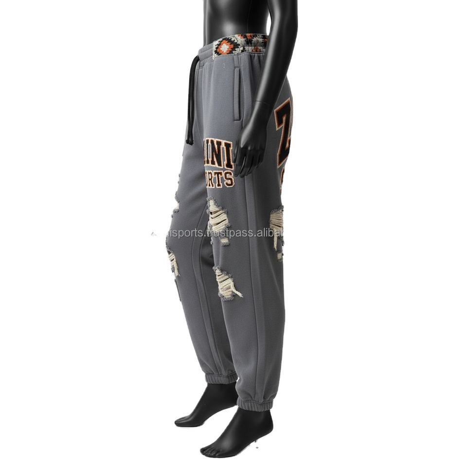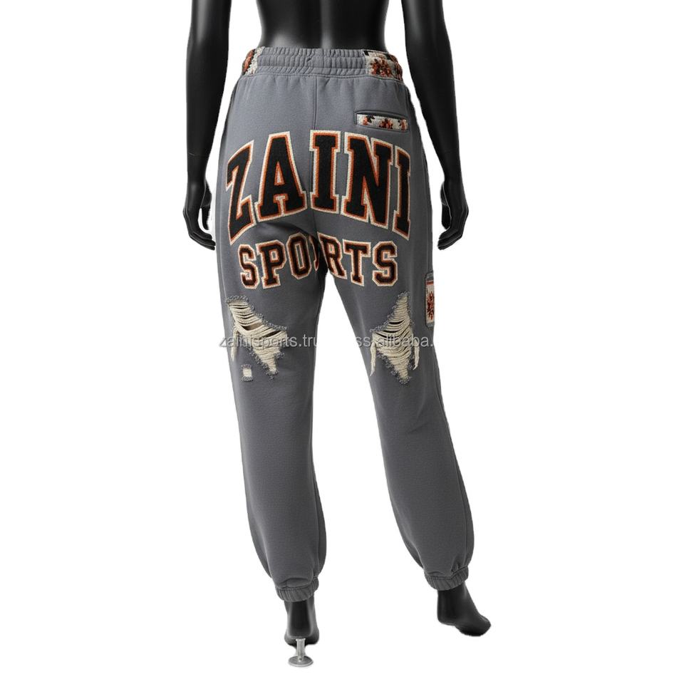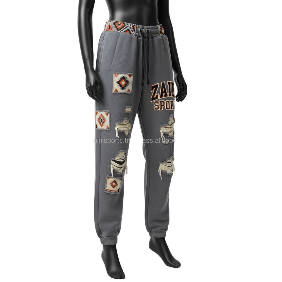 High Quality Women Jogger Pant GSM Soft Cotton Fleece Fabric Grey Tone Ripped Style With Embroidery Patch Custom Logo Printing