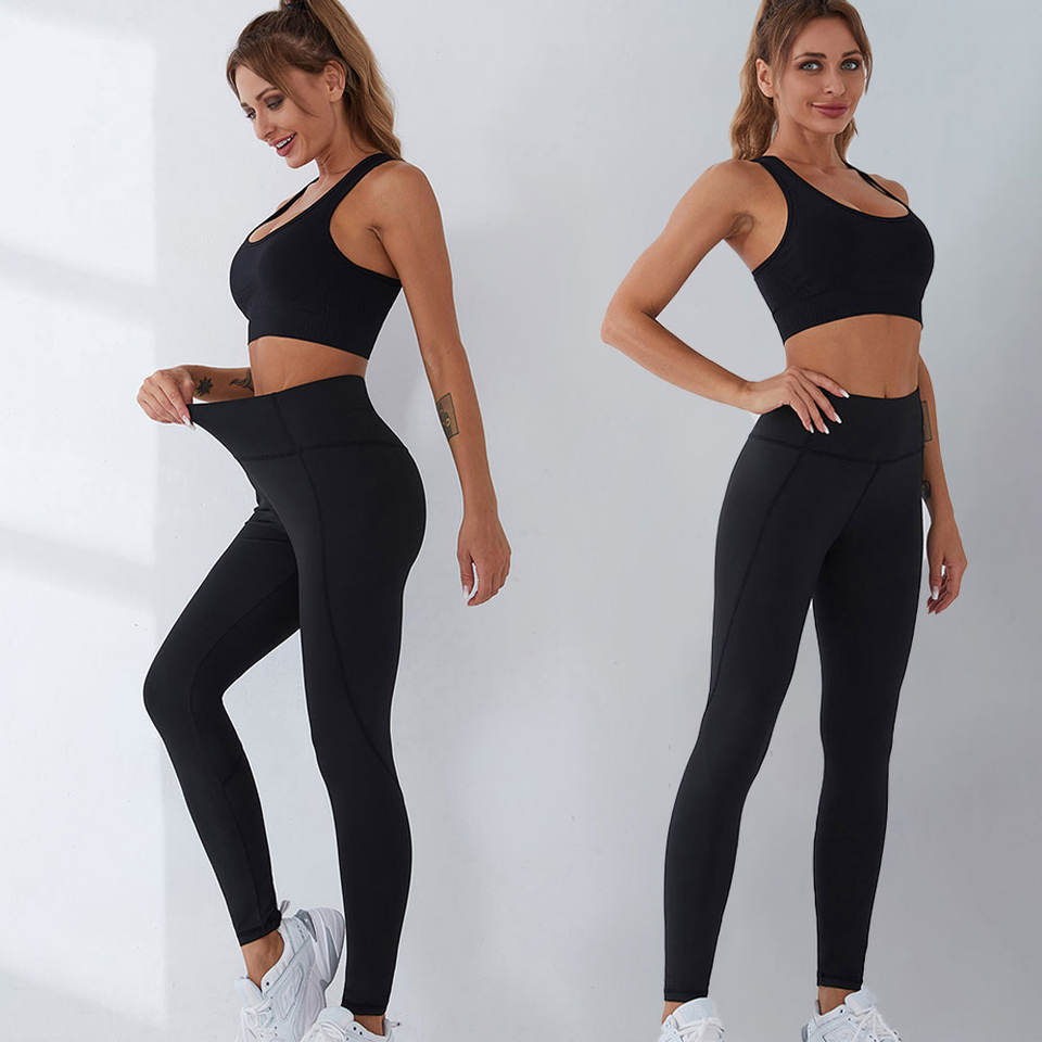 High Quality Women's Yoga Gym Workout Set Breathable Seamless Solid Pattern Front Logo Elastic Waist Racerback High-Waisted