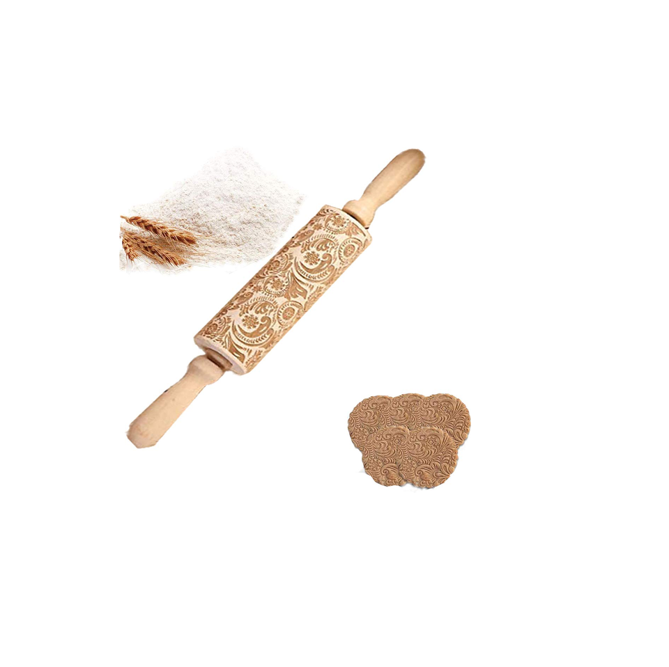 High Quality Wood Rolling Pin Cockise Use Bickit Embossed Rolling Pin with Christmas Pattern and Natural Craft