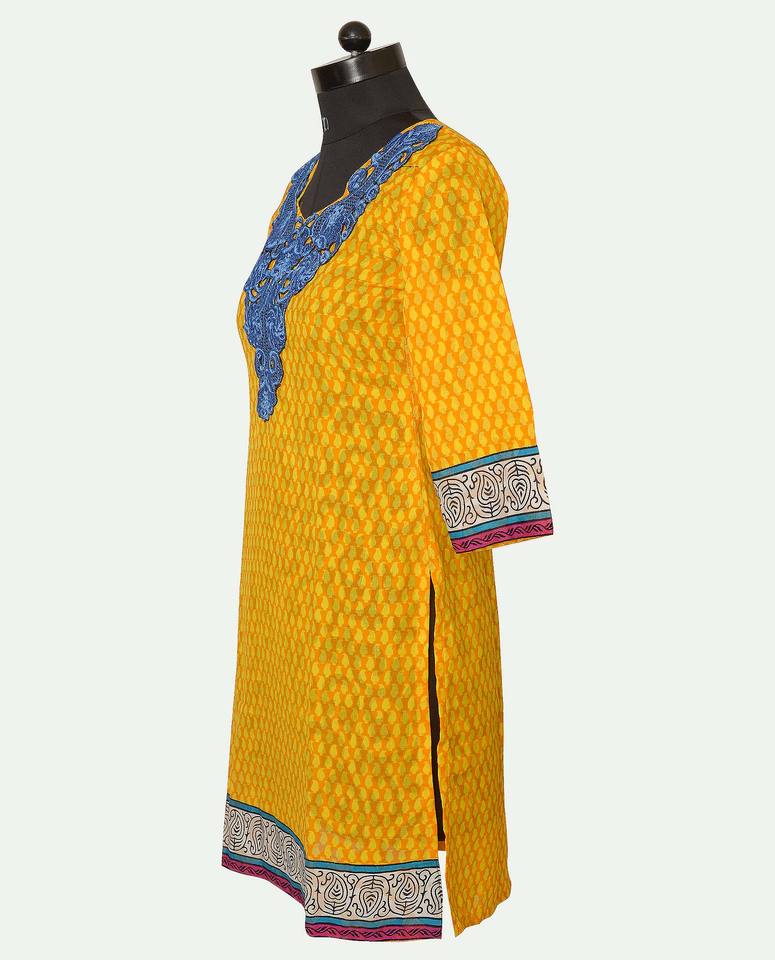 High Quality Yellow Cotton Kurti for Adults Long-Sleeved Casual Summer Ethnic Top with Hand Embroidery Indian & Pakistani Style