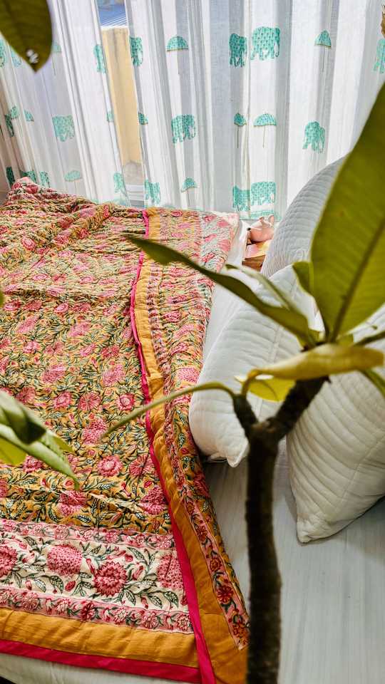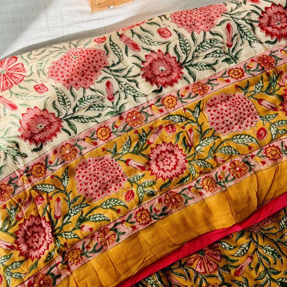 High Quality Yellow Dalia Hand Block Print Reversible Quilt 200GSM Cotton Hand Stitched 90 X108" Size Luxury Bedding Quilt