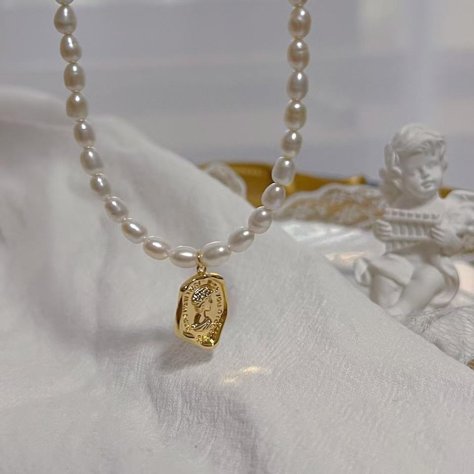 High Quality Young Clavicle Chain Queen Gold Coin Pendant 5MM Freshwater Rice Shaped Seedless Pearl Necklace Irregular Fashion