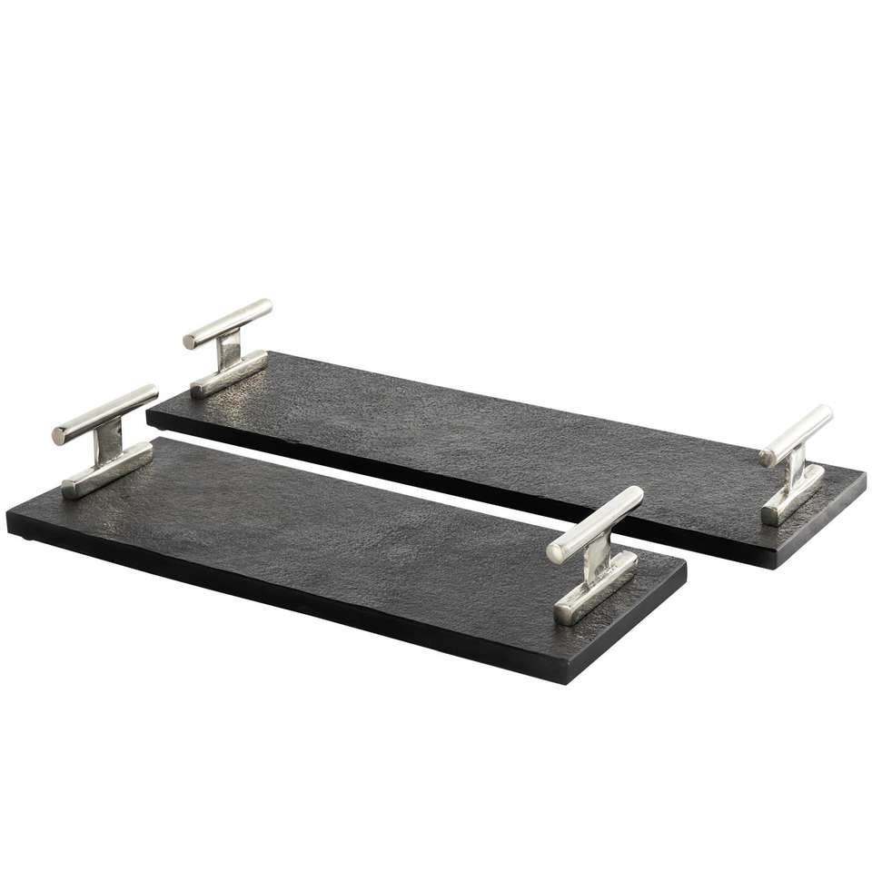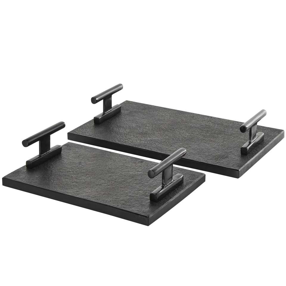 Wholesale Set of 2 Black Marble Textured Metal Serving Trays Custom Size 15\" 12\" with Silver Rod Handles for Home Use