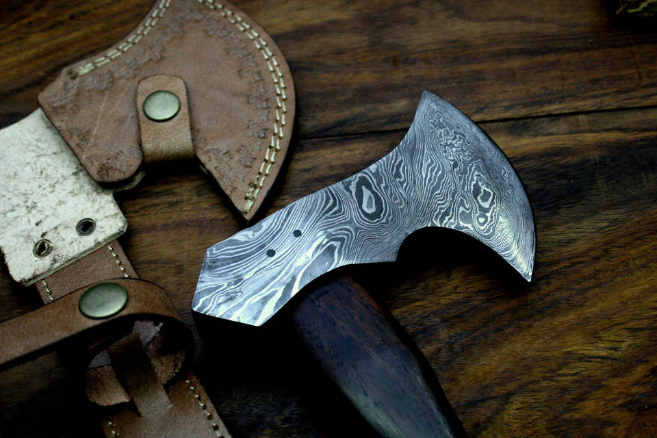 Highly Rated Handmade Damascus Steel Axe Hatchet Industrial Grade Outdoor Camping Tool with Wood Handle and Leather Sheath