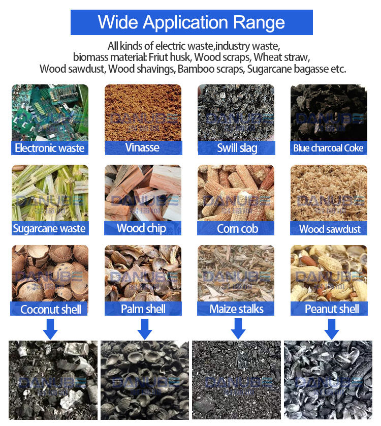 Applicable raw materials:Wood Sawdust briquette Bamboo Palm shell Walnut shell Rice husk