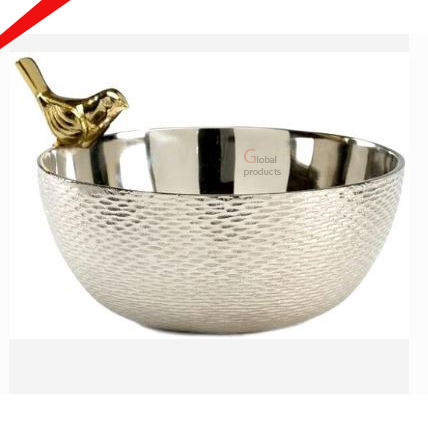 High Selling Silver Finished Round Shape Serving Bowl With Golden Bird Design